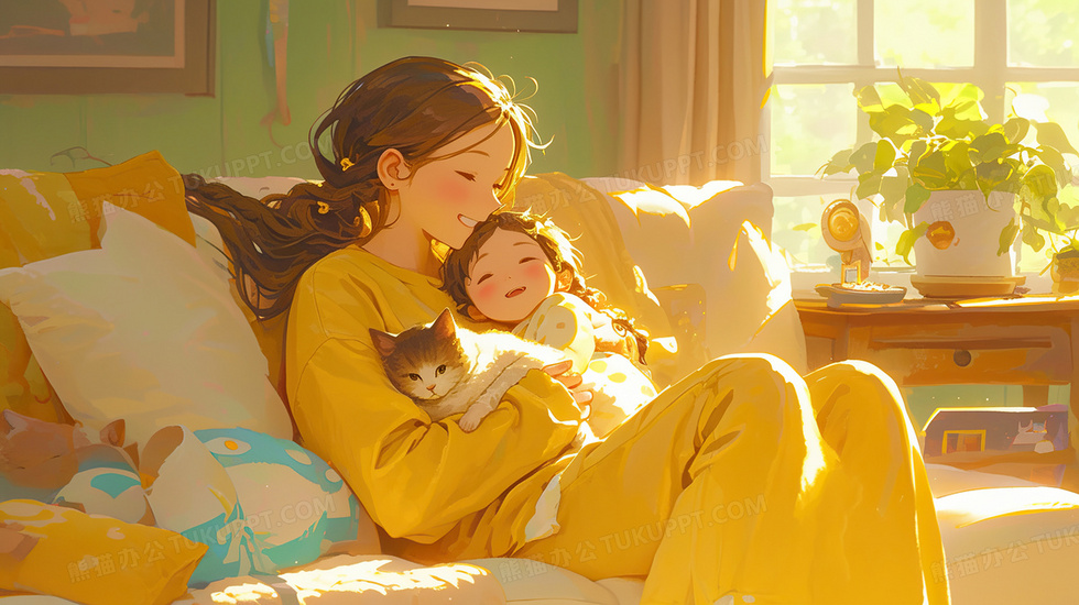 本作品内容为妈妈抱着孩子和宠物温馨场景插画, 格式为 jpg, 大小3 MB, 图片尺寸为2912 x 1632, 源文件无水印, 欢迎使用熊猫办公。 如认为平台内容涉嫌侵权,可通过邮件:tousu@tukuppt.com提出书面通知,我们将及时处理。