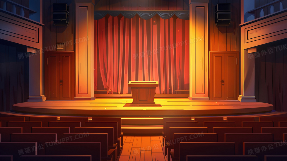 本作品内容为黄色剧院舞台场景插画, 格式为 jpg, 大小2 MB, 图片尺寸为2912 x 1632, 源文件无水印, 欢迎使用熊猫办公。 如认为平台内容涉嫌侵权,可通过邮件:tousu@tukuppt.com提出书面通知,我们将及时处理。