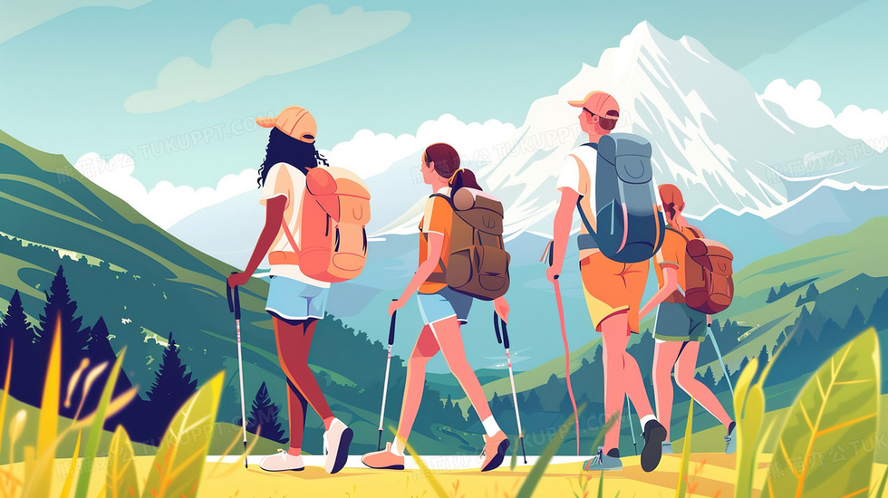 本作品内容为登山运动旅游的一群年轻人插画, 格式为 jpg, 大小2 MB, 图片尺寸为2912 x 1632, 源文件无水印, 欢迎使用熊猫办公。 如认为平台内容涉嫌侵权,可通过邮件:tousu@tukuppt.com提出书面通知,我们将及时处理。