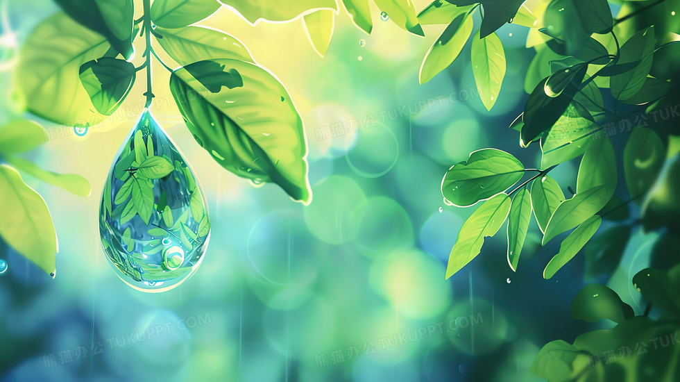 本作品内容为绿色植物树叶上的水珠小清新插画背景图, 格式为 jpg, 大小3 MB, 图片尺寸为2912 x 1632, 作品中背景图片无需修改, 源文件无水印,可以直接使用, 欢迎使用熊猫办公。 如认为平台内容涉嫌侵权,可通过邮件:tousu@tukuppt.com提出书面通知,我们将及时处理。