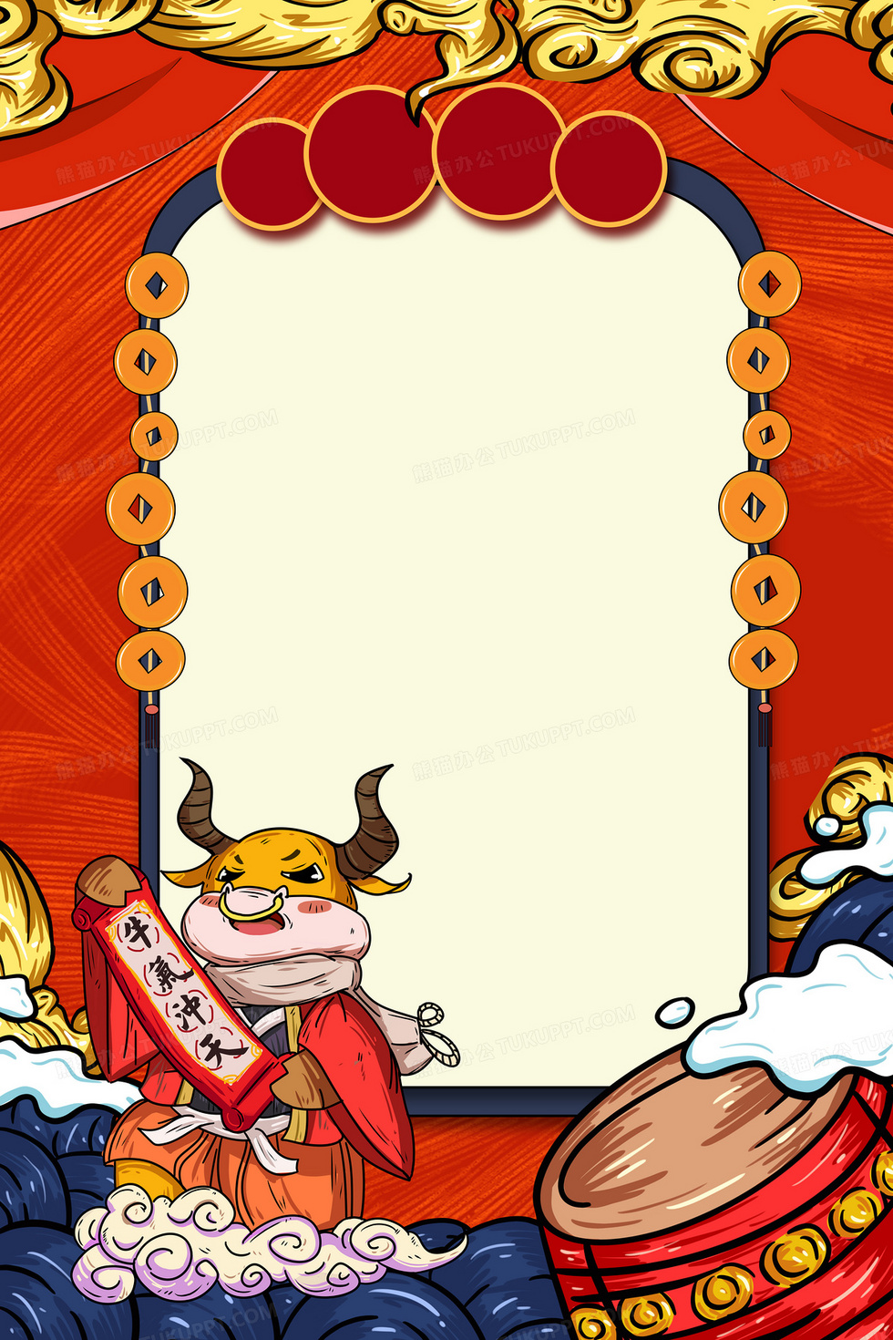 本作品内容为国潮风牛年新年喜庆牛年大吉背景, 格式为 psd, 大小34 MB, 图片尺寸为3543 x 5315, 作品中背景图片无需修改, 源文件无水印,可以直接使用, 欢迎使用熊猫办公。 如认为平台内容涉嫌侵权,可通过邮件:tousu@tukuppt.com提出书面通知,我们将及时处理。