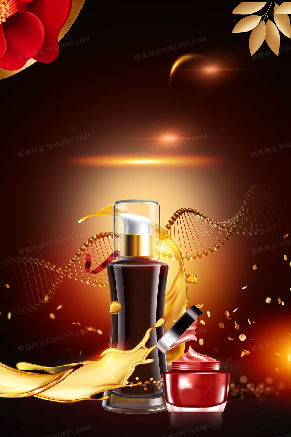 本作品内容为黑金华丽化妆品美容护肤背景设计, 格式为 psd, 大小30 MB, 图片尺寸为2362 x 3543, 作品中背景图片无需修改, 源文件无水印,可以直接使用, 欢迎使用熊猫办公。 如认为平台内容涉嫌侵权,可通过邮件:tousu@tukuppt.com提出书面通知,我们将及时处理。