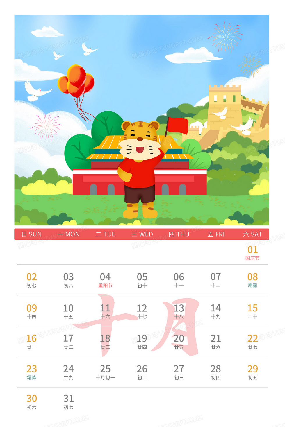 本作品内容为2022虎年日历十月份插画背景, 格式为 psd, 大小19 MB, 图片尺寸为3543 x 5315, 作品中背景图片无需修改, 源文件无水印,可以直接使用, 欢迎使用熊猫办公。 如认为平台内容涉嫌侵权,可通过邮件:tousu@tukuppt.com提出书面通知,我们将及时处理。