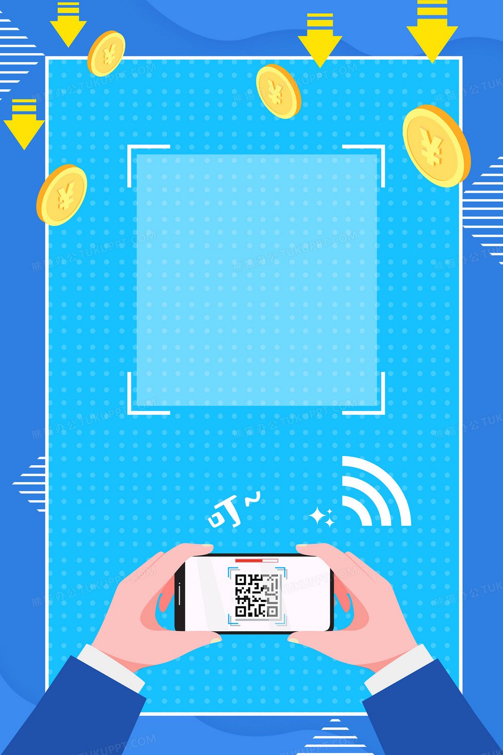 本作品内容为手机支付电子二维码扫码支付背景, 格式为 psd, 大小12 MB, 图片尺寸为3543 x 5315, 作品中背景图片无需修改, 源文件无水印,可以直接使用, 欢迎使用熊猫办公。 如认为平台内容涉嫌侵权,可通过邮件:tousu@tukuppt.com提出书面通知,我们将及时处理。