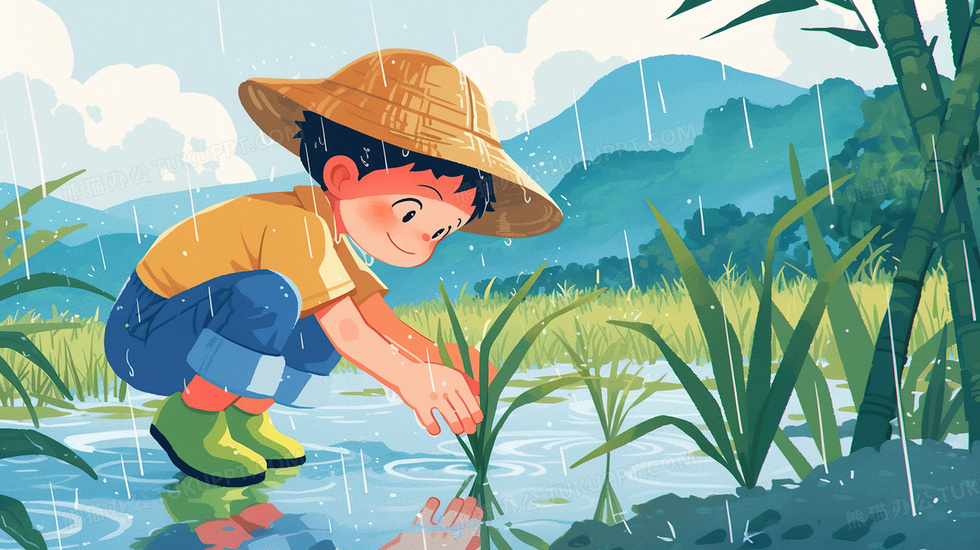 本作品内容为雨天农田小男孩种水稻农业插画, 格式为 jpg, 大小4 MB, 图片尺寸为2912 x 1632, 源文件无水印, 欢迎使用熊猫办公。 如认为平台内容涉嫌侵权,可通过邮件:tousu@tukuppt.com提出书面通知,我们将及时处理。