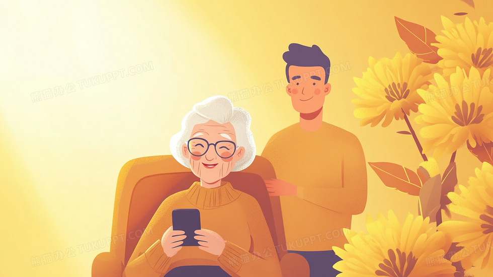 本作品内容为关爱老年人儿子与母亲重阳节插画风背景, 格式为 jpg, 大小2 MB, 图片尺寸为2912 x 1632, 作品中背景图片无需修改, 源文件无水印,可以直接使用, 欢迎使用熊猫办公。 如认为平台内容涉嫌侵权,可通过邮件:tousu@tukuppt.com提出书面通知,我们将及时处理。