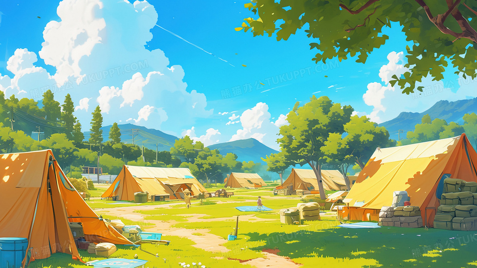 本作品内容为蓝天白云草地帐篷插画, 格式为 jpg, 大小3 MB, 图片尺寸为2912 x 1632, 源文件无水印, 欢迎使用熊猫办公。 如认为平台内容涉嫌侵权,可通过邮件:tousu@tukuppt.com提出书面通知,我们将及时处理。