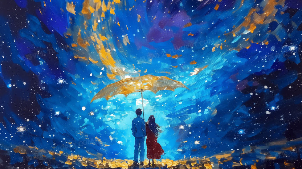 本作品内容为七夕情人节梵高油画风一对情侣在蓝色的夜空下散步插画, 格式为 jpg, 大小8 MB, 图片尺寸为2912 x 1632, 源文件无水印, 欢迎使用熊猫办公。 如认为平台内容涉嫌侵权,可通过邮件:tousu@tukuppt.com提出书面通知,我们将及时处理。