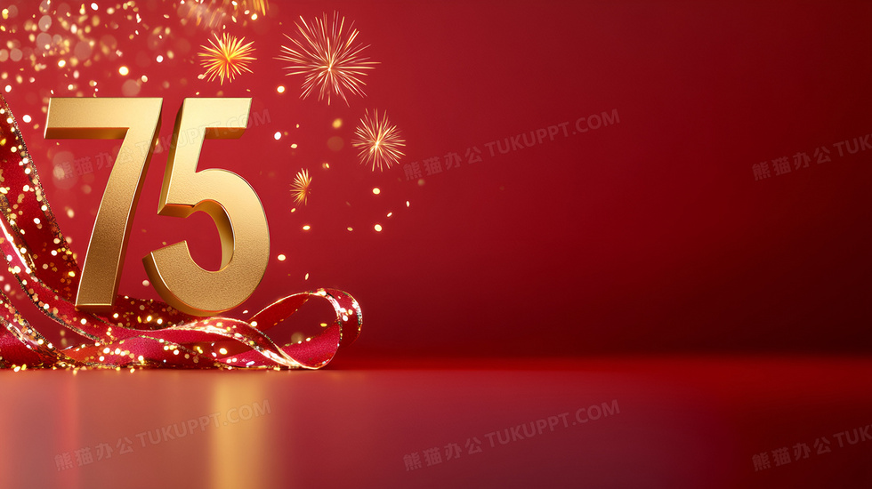 本作品内容为红金简约国庆节75周年背景, 格式为 jpg, 大小2 MB, 图片尺寸为2912 x 1632, 作品中背景图片无需修改, 源文件无水印,可以直接使用, 欢迎使用熊猫办公。 如认为平台内容涉嫌侵权,可通过邮件:tousu@tukuppt.com提出书面通知,我们将及时处理。