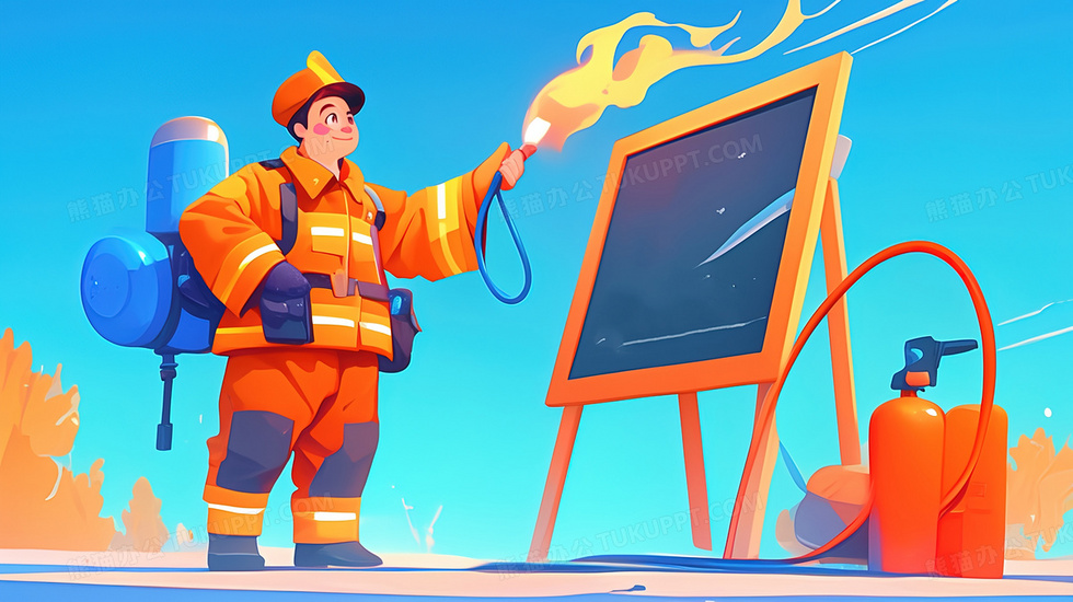 本作品内容为消防员背着灭火器演习宣传插画, 格式为 jpg, 大小2 MB, 图片尺寸为2912 x 1632, 源文件无水印, 欢迎使用熊猫办公。 如认为平台内容涉嫌侵权,可通过邮件:tousu@tukuppt.com提出书面通知,我们将及时处理。