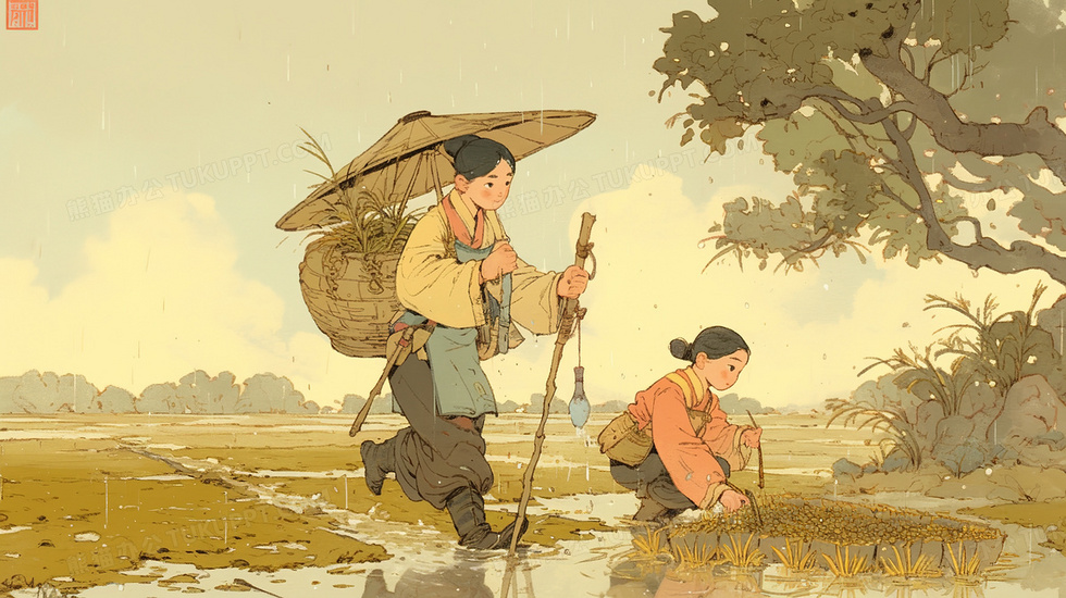 本作品内容为下雨天田间劳动的农民插画, 格式为 jpg, 大小3 MB, 图片尺寸为2912 x 1632, 源文件无水印, 欢迎使用熊猫办公。 如认为平台内容涉嫌侵权,可通过邮件:tousu@tukuppt.com提出书面通知,我们将及时处理。