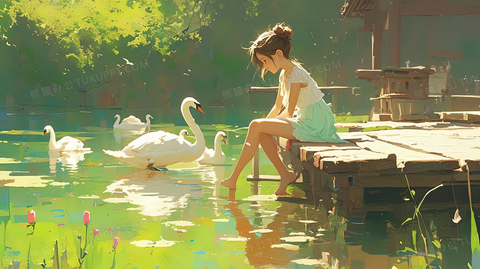 本作品内容为夏天坐在池塘看天鹅的少女插画, 格式为 jpg, 大小5 MB, 图片尺寸为2912 x 1632, 源文件无水印, 欢迎使用熊猫办公。 如认为平台内容涉嫌侵权,可通过邮件:tousu@tukuppt.com提出书面通知,我们将及时处理。