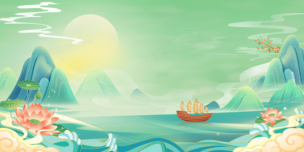 本作品内容为国潮中国风帆船国潮山水背景, 格式为 psd, 大小73 MB, 图片尺寸为4724 x 2362, 作品中背景图片无需修改, 源文件无水印,可以直接使用, 欢迎使用熊猫办公。 如认为平台内容涉嫌侵权,可通过邮件:tousu@tukuppt.com提出书面通知,我们将及时处理。
