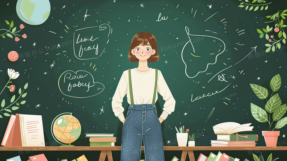 本作品内容为卡通女老师站在黑板前教师节插画, 格式为 jpg, 大小4 MB, 图片尺寸为2912 x 1632, 源文件无水印, 欢迎使用熊猫办公。 如认为平台内容涉嫌侵权,可通过邮件:tousu@tukuppt.com提出书面通知,我们将及时处理。