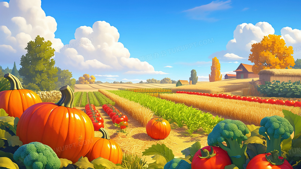 本作品内容为蓝天白云农田秋季丰收瓜果插画, 格式为 jpg, 大小3 MB, 图片尺寸为2912 x 1632, 源文件无水印, 欢迎使用熊猫办公。 如认为平台内容涉嫌侵权,可通过邮件:tousu@tukuppt.com提出书面通知,我们将及时处理。