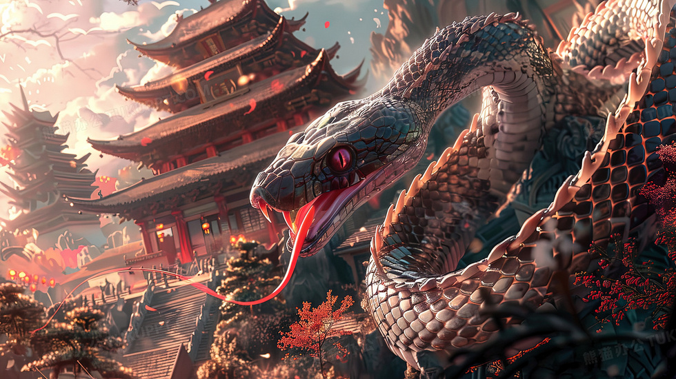 首页 > 插画 > 科技艺术 > 国潮风 > 气势磅礴蛇年水墨中式建筑与蛇插画