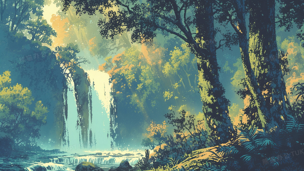 本作品内容为夏季大自然瀑布景色插画, 格式为 jpg, 大小3 MB, 图片尺寸为2912 x 1632, 源文件无水印, 欢迎使用熊猫办公。 如认为平台内容涉嫌侵权,可通过邮件:tousu@tukuppt.com提出书面通知,我们将及时处理。