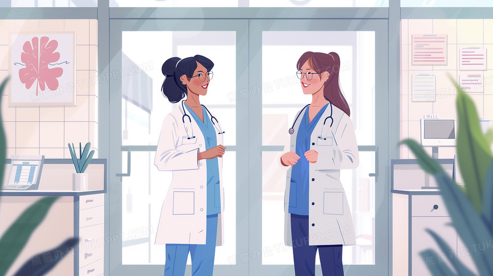 本作品内容为医院两个医生正在交谈场景插画, 格式为 jpg, 大小3 MB, 图片尺寸为2912 x 1632, 源文件无水印, 欢迎使用熊猫办公。 如认为平台内容涉嫌侵权,可通过邮件:tousu@tukuppt.com提出书面通知,我们将及时处理。