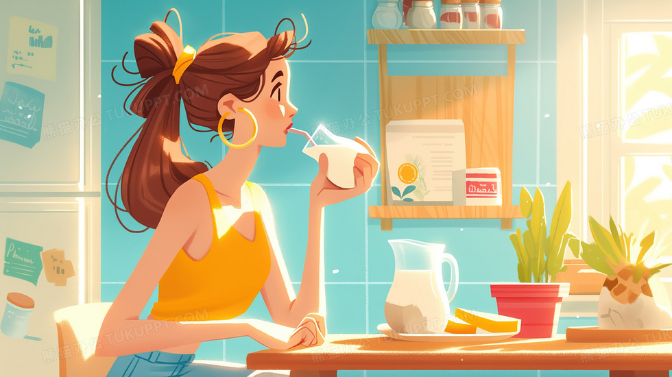 本作品内容为早餐喝牛奶的女孩插画, 格式为 jpg, 大小2 MB, 图片尺寸为2912 x 1632, 源文件无水印, 欢迎使用熊猫办公。 如认为平台内容涉嫌侵权,可通过邮件:tousu@tukuppt.com提出书面通知,我们将及时处理。