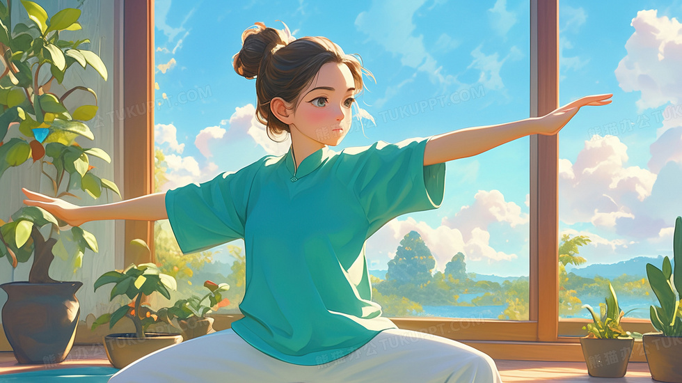 本作品内容为清晨室内武术运动锻炼女子插画, 格式为 jpg, 大小3 MB, 图片尺寸为2912 x 1632, 源文件无水印, 欢迎使用熊猫办公。 如认为平台内容涉嫌侵权,可通过邮件:tousu@tukuppt.com提出书面通知,我们将及时处理。