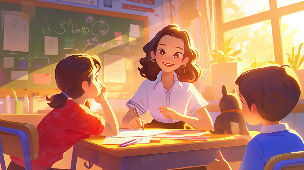 本作品内容为课堂辅导学生作业的女老师插画, 格式为 jpg, 大小3 MB, 图片尺寸为2912 x 1632, 源文件无水印, 欢迎使用熊猫办公。 如认为平台内容涉嫌侵权,可通过邮件:tousu@tukuppt.com提出书面通知,我们将及时处理。
