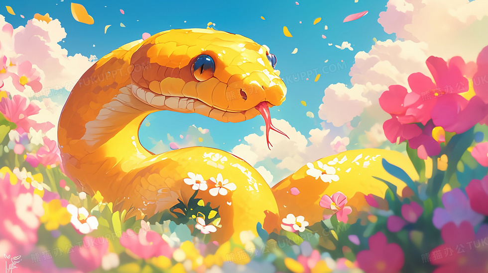 本作品内容为卡通花丛里的蛇新年插画, 格式为 jpg, 大小2 MB, 图片尺寸为2912 x 1632, 源文件无水印, 欢迎使用熊猫办公。 如认为平台内容涉嫌侵权,可通过邮件:tousu@tukuppt.com提出书面通知,我们将及时处理。