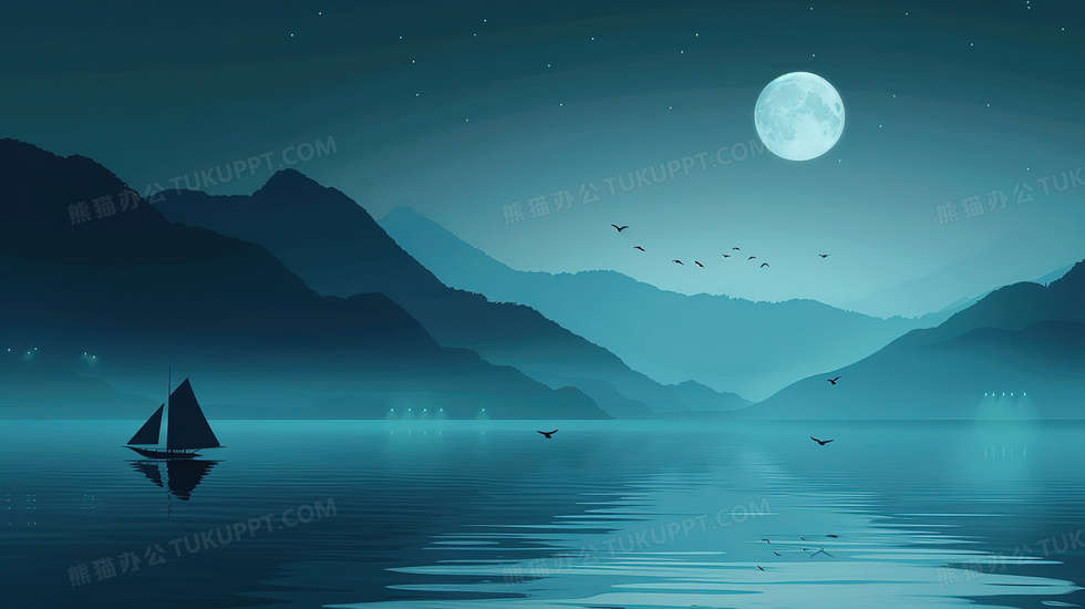 本作品内容为湖面山水月亮渔船背景, 格式为 jpg, 大小4 MB, 图片尺寸为2912 x 1632, 作品中背景图片无需修改, 源文件无水印,可以直接使用, 欢迎使用熊猫办公。 如认为平台内容涉嫌侵权,可通过邮件:tousu@tukuppt.com提出书面通知,我们将及时处理。