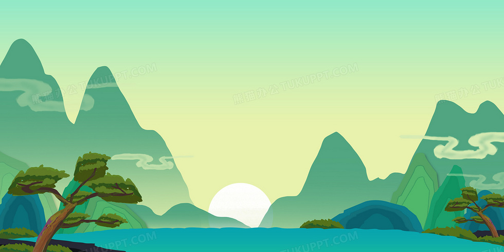 本作品内容为扁平化清新中国风山水松柏背景, 格式为 psd, 大小13 MB, 图片尺寸为4724 x 2362, 作品中背景图片无需修改, 源文件无水印,可以直接使用, 欢迎使用熊猫办公。 如认为平台内容涉嫌侵权,可通过邮件:tousu@tukuppt.com提出书面通知,我们将及时处理。