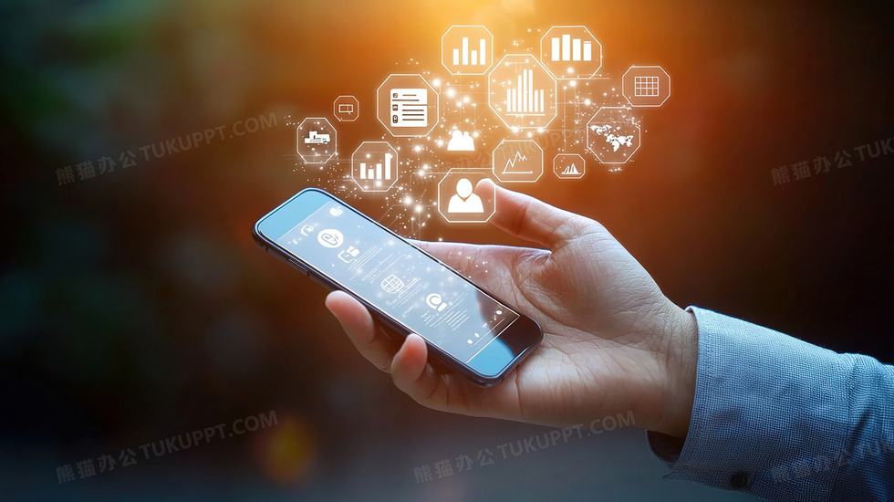 本作品内容为手掌上的智能手机虚拟图标创意背景, 格式为 jpg, 大小2 MB, 图片尺寸为2912 x 1632, 作品中背景图片无需修改, 源文件无水印,可以直接使用, 欢迎使用熊猫办公。 如认为平台内容涉嫌侵权,可通过邮件:tousu@tukuppt.com提出书面通知,我们将及时处理。