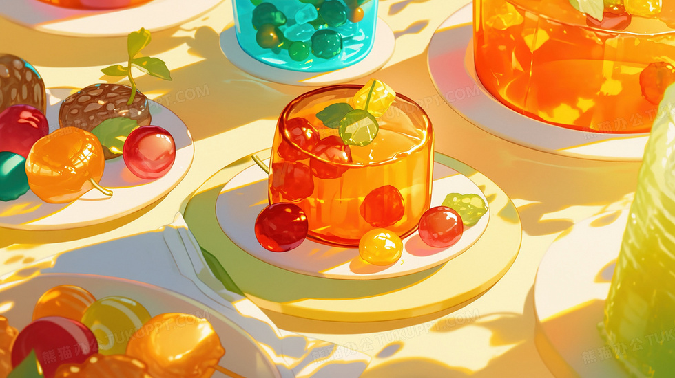 本作品内容为桌上晶莹剔透的食品果冻插画, 格式为 jpg, 大小3 MB, 图片尺寸为2912 x 1632, 源文件无水印, 欢迎使用熊猫办公。 如认为平台内容涉嫌侵权,可通过邮件:tousu@tukuppt.com提出书面通知,我们将及时处理。