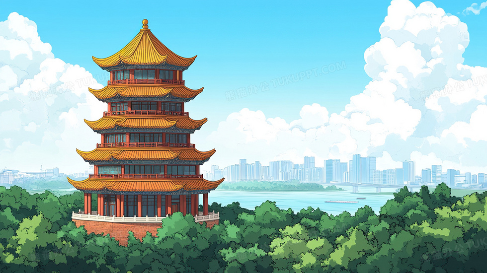 本作品内容为武汉黄鹤楼建筑插画, 格式为 jpg, 大小3 MB, 图片尺寸为2912 x 1632, 源文件无水印, 欢迎使用熊猫办公。 如认为平台内容涉嫌侵权,可通过邮件:tousu@tukuppt.com提出书面通知,我们将及时处理。