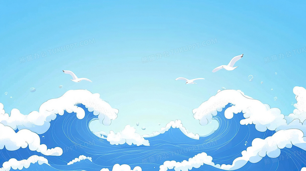 本作品内容为简约卡通海浪背景, 格式为 jpg, 大小3 MB, 图片尺寸为2912 x 1632, 作品中背景图片无需修改, 源文件无水印,可以直接使用, 欢迎使用熊猫办公。 如认为平台内容涉嫌侵权,可通过邮件:tousu@tukuppt.com提出书面通知,我们将及时处理。