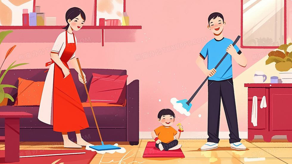 本作品内容为爸爸妈妈打扫卫生男孩捣乱创意插画, 格式为 jpg, 大小2 MB, 图片尺寸为2912 x 1632, 源文件无水印, 欢迎使用熊猫办公。 如认为平台内容涉嫌侵权,可通过邮件:tousu@tukuppt.com提出书面通知,我们将及时处理。