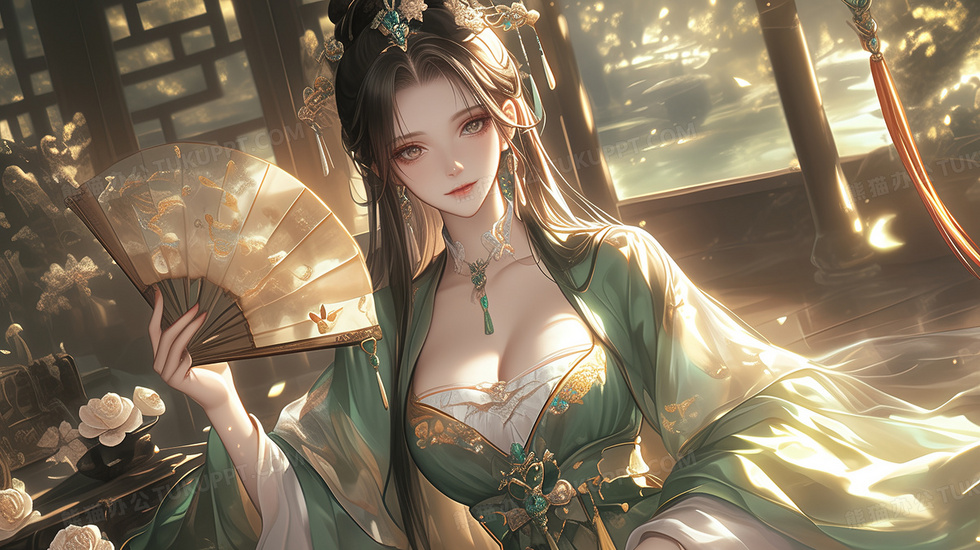 本作品内容为中国风拿扇子的古风汉服美女插画, 格式为 jpg, 大小3 MB, 图片尺寸为2912 x 1632, 源文件无水印, 欢迎使用熊猫办公。 如认为平台内容涉嫌侵权,可通过邮件:tousu@tukuppt.com提出书面通知,我们将及时处理。