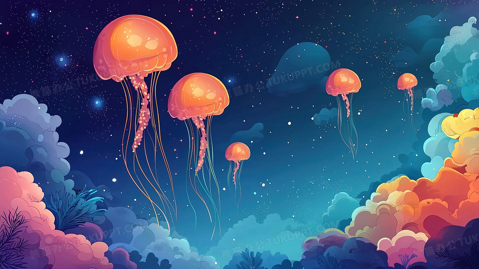 本作品内容为治愈系列奇妙梦幻空中飞翔的水母插画, 格式为 jpg, 大小3 MB, 图片尺寸为2912 x 1632, 源文件无水印, 欢迎使用熊猫办公。 如认为平台内容涉嫌侵权,可通过邮件:tousu@tukuppt.com提出书面通知,我们将及时处理。
