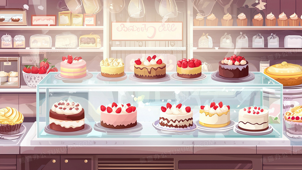 本作品内容为橱窗展示各式各样的蛋糕插画, 格式为 jpg, 大小3 MB, 图片尺寸为2912 x 1632, 源文件无水印, 欢迎使用熊猫办公。 如认为平台内容涉嫌侵权,可通过邮件:tousu@tukuppt.com提出书面通知,我们将及时处理。