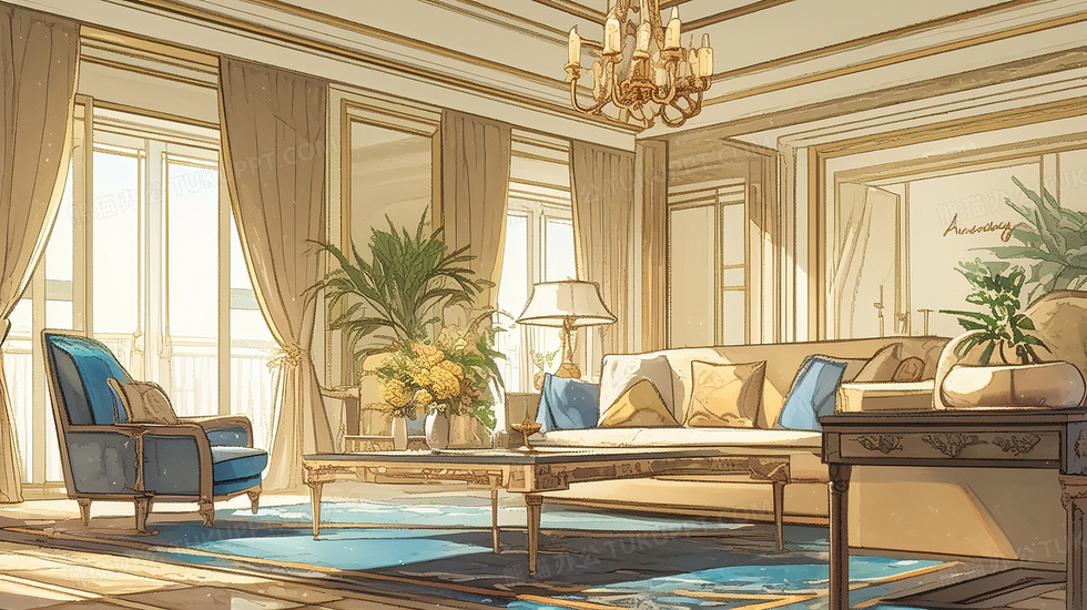 本作品内容为家居装修客厅大厅插画, 格式为 jpg, 大小4 MB, 图片尺寸为2912 x 1632, 源文件无水印, 欢迎使用熊猫办公。 如认为平台内容涉嫌侵权,可通过邮件:tousu@tukuppt.com提出书面通知,我们将及时处理。