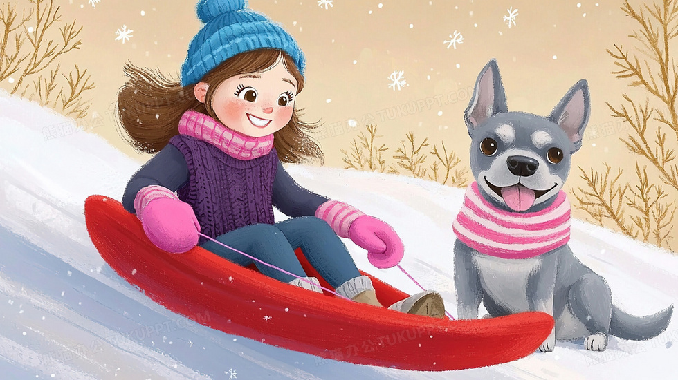 本作品内容为冬季坐雪橇滑雪的小女孩和宠物狗插画, 格式为 jpg, 大小3 MB, 图片尺寸为2912 x 1632, 源文件无水印, 欢迎使用熊猫办公。 如认为平台内容涉嫌侵权,可通过邮件:tousu@tukuppt.com提出书面通知,我们将及时处理。