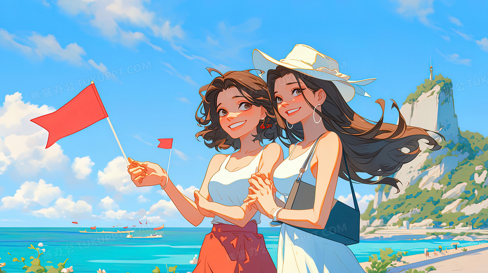 本作品内容为国庆出游手拿红旗打卡的两姐妹插画, 格式为 jpg, 大小3 MB, 图片尺寸为2912 x 1632, 源文件无水印, 欢迎使用熊猫办公。 如认为平台内容涉嫌侵权,可通过邮件:tousu@tukuppt.com提出书面通知,我们将及时处理。