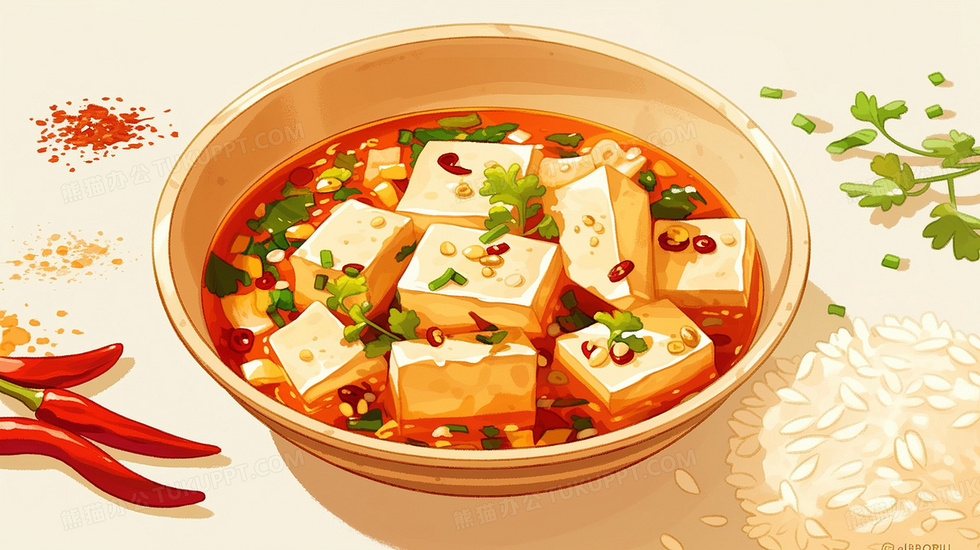 本作品内容为中餐川菜麻婆豆腐美食插画, 格式为 jpg, 大小3 MB, 图片尺寸为2912 x 1632, 源文件无水印, 欢迎使用熊猫办公。 如认为平台内容涉嫌侵权,可通过邮件:tousu@tukuppt.com提出书面通知,我们将及时处理。