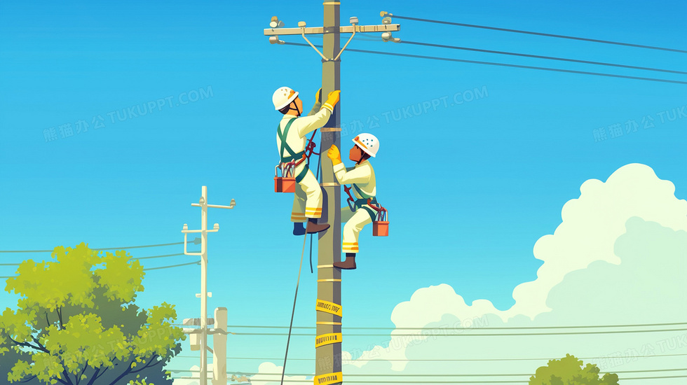 本作品内容为蓝天下高空作业劳动的电力实施工人维修插画, 格式为 jpg, 大小2 MB, 图片尺寸为2912 x 1632, 源文件无水印, 欢迎使用熊猫办公。 如认为平台内容涉嫌侵权,可通过邮件:tousu@tukuppt.com提出书面通知,我们将及时处理。