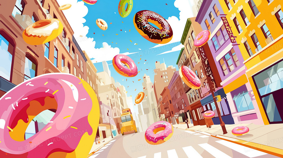 本作品内容为漂浮在天空中的甜甜圈零食插画, 格式为 jpg, 大小3 MB, 图片尺寸为2912 x 1632, 源文件无水印, 欢迎使用熊猫办公。 如认为平台内容涉嫌侵权,可通过邮件:tousu@tukuppt.com提出书面通知,我们将及时处理。