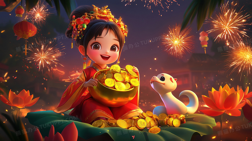 本作品内容为喜庆蛇年荷叶上抱金砖女孩与蛇烟花插画, 格式为 jpg, 大小3 MB, 图片尺寸为2912 x 1632, 源文件无水印, 欢迎使用熊猫办公。 如认为平台内容涉嫌侵权,可通过邮件:tousu@tukuppt.com提出书面通知,我们将及时处理。