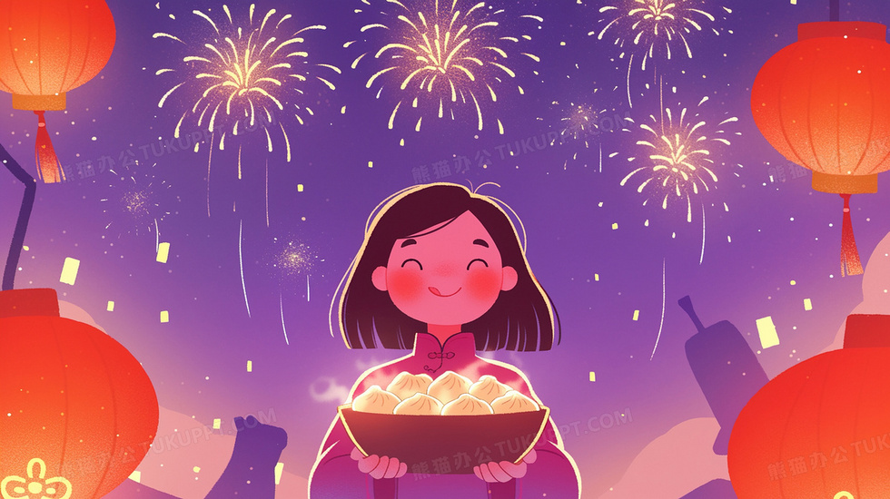 本作品内容为烟花喜庆春节手捧美食包子的女孩插画, 格式为 jpg, 大小3 MB, 图片尺寸为2912 x 1632, 源文件无水印, 欢迎使用熊猫办公。 如认为平台内容涉嫌侵权,可通过邮件:tousu@tukuppt.com提出书面通知,我们将及时处理。