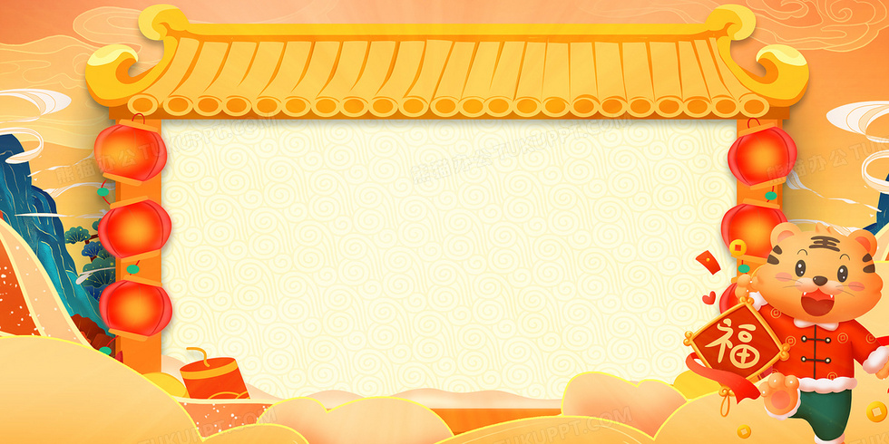 本作品内容为国潮黄色春节虎年门头边框背景, 格式为 psd, 大小94 MB, 图片尺寸为4724 x 2362, 作品中背景图片无需修改, 源文件无水印,可以直接使用, 欢迎使用熊猫办公。 如认为平台内容涉嫌侵权,可通过邮件:tousu@tukuppt.com提出书面通知,我们将及时处理。