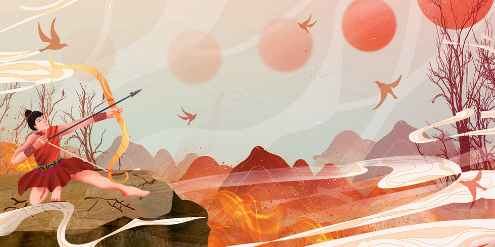 本作品内容为后羿射日神话故事插画背景, 格式为 psd, 大小131 MB, 图片尺寸为4724 x 2362, 作品中背景图片无需修改, 源文件无水印,可以直接使用, 欢迎使用熊猫办公。 如认为平台内容涉嫌侵权,可通过邮件:tousu@tukuppt.com提出书面通知,我们将及时处理。