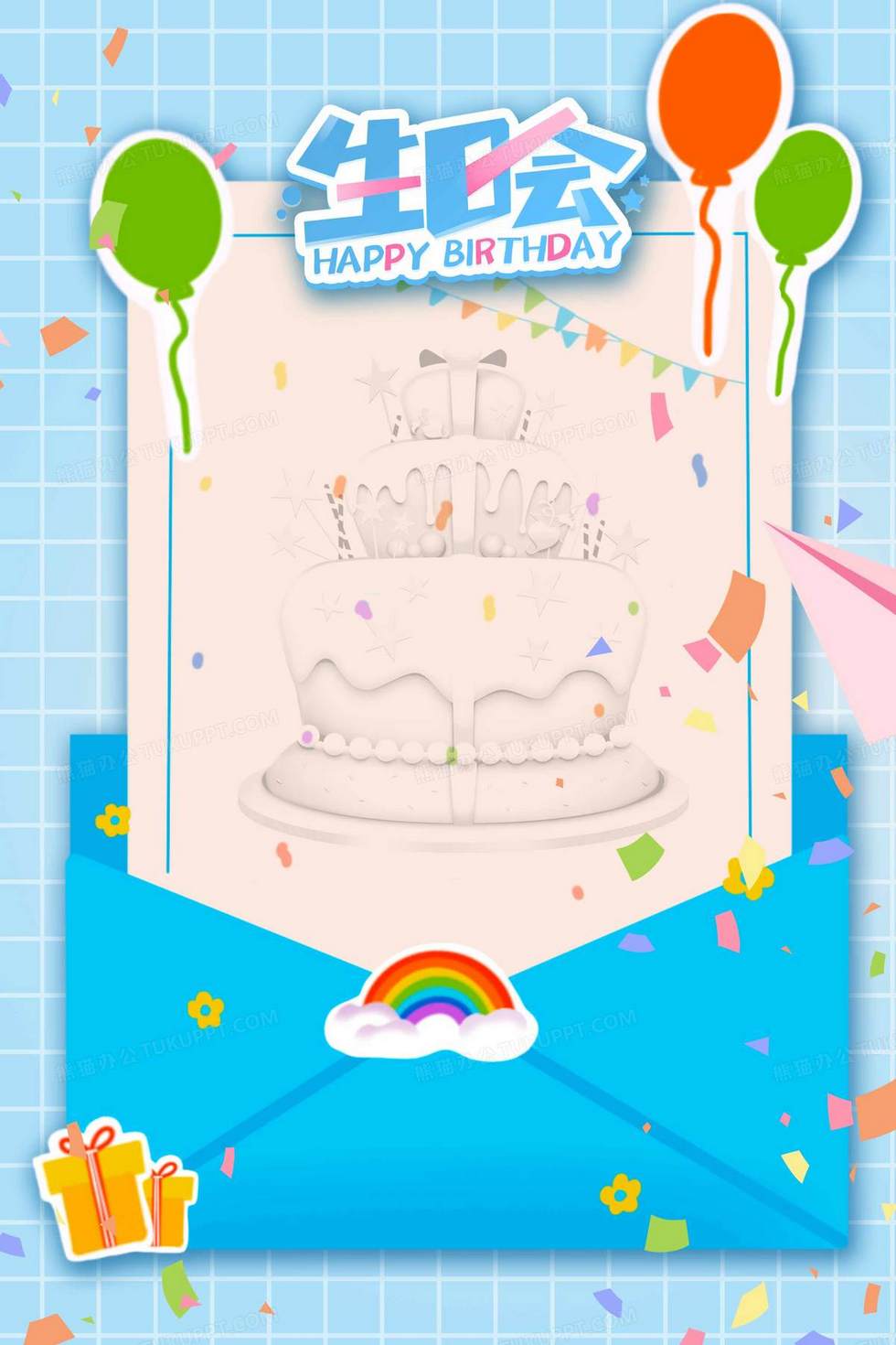 本作品内容为卡通扁平风信封生日邀请函背景, 格式为 psd, 大小15 MB, 图片尺寸为2362 x 3543, 作品中背景图片无需修改, 源文件无水印,可以直接使用, 欢迎使用熊猫办公。 如认为平台内容涉嫌侵权,可通过邮件:tousu@tukuppt.com提出书面通知,我们将及时处理。