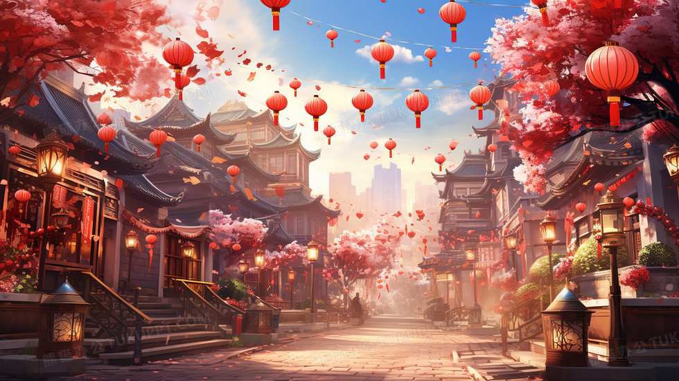 本作品内容为挂满红灯笼的古色古香的街道节日场景插画, 格式为 jpg, 大小8 MB, 图片尺寸为2912 x 1632, 源文件无水印, 欢迎使用熊猫办公。 如认为平台内容涉嫌侵权,可通过邮件:tousu@tukuppt.com提出书面通知,我们将及时处理。