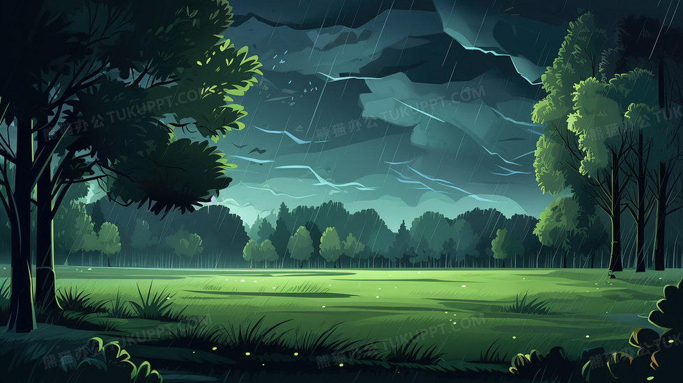 本作品内容为公园里的倾盆大雨和乌云密布的天空插画, 格式为 jpg, 大小5 MB, 图片尺寸为2912 x 1632, 源文件无水印, 欢迎使用熊猫办公。 如认为平台内容涉嫌侵权,可通过邮件:tousu@tukuppt.com提出书面通知,我们将及时处理。