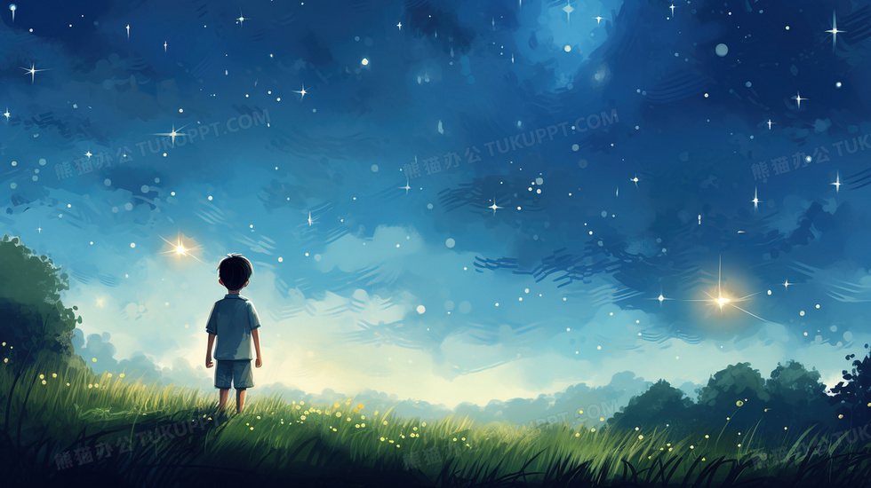 本作品内容为唯美梦幻星空下的男孩卡通插画, 格式为 jpg, 大小5 MB, 图片尺寸为2912 x 1632, 源文件无水印, 欢迎使用熊猫办公。 如认为平台内容涉嫌侵权,可通过邮件:tousu@tukuppt.com提出书面通知,我们将及时处理。